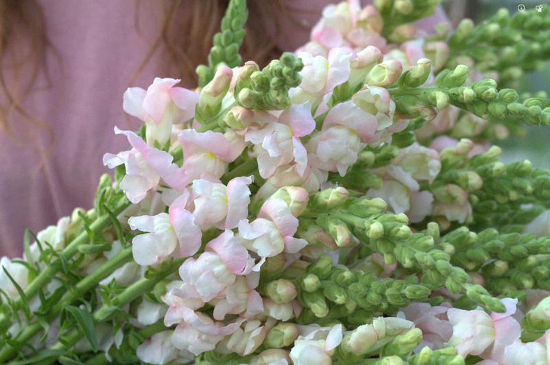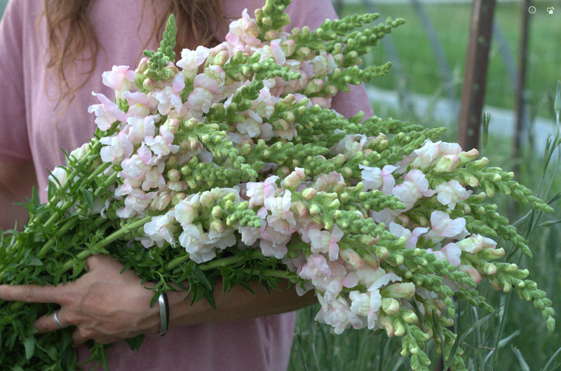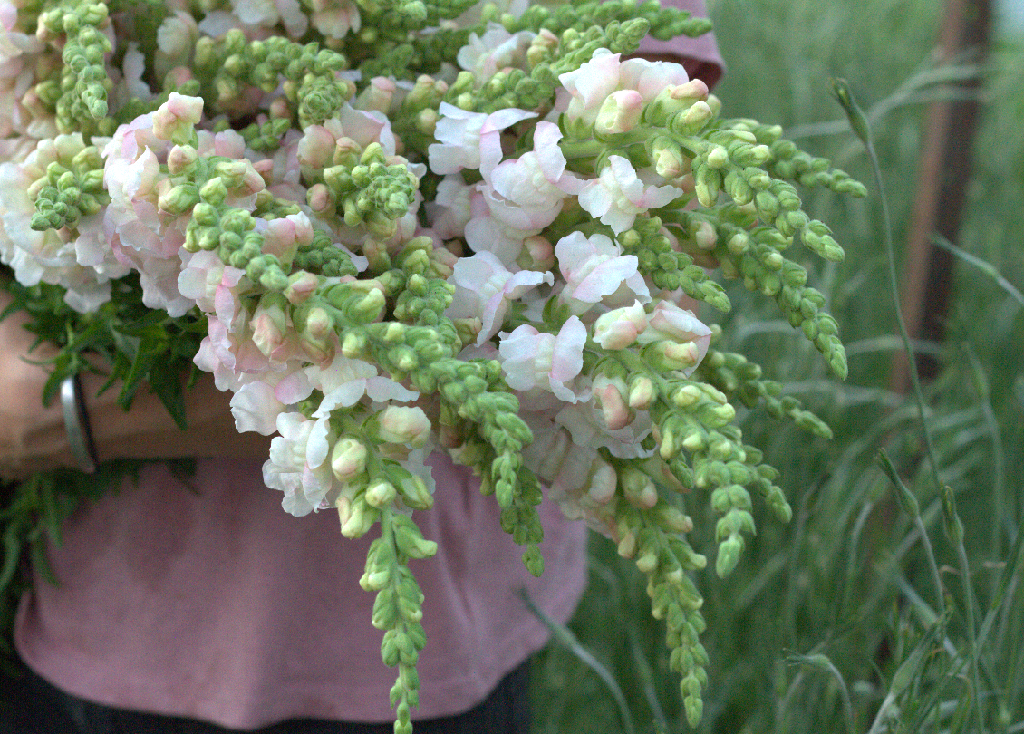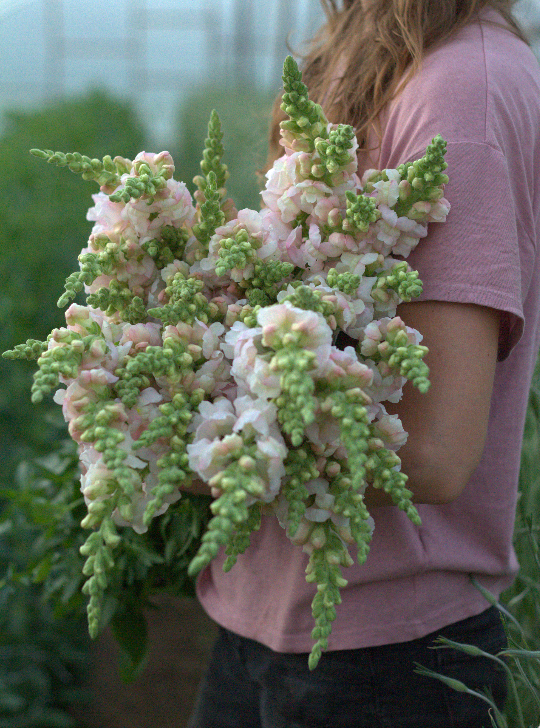 Un jour, aux débuts de Floramama, je récoltais des mufliers et j'ai observé une abeille venir y butiner. Elle savait qu'il fallait "ouvrir" la fleur pour accéder au pollen. Je me souviens avoir été ébahi par le savoir intrinsèque de la nature. En effet, les mufliers sont aussi appelés gueules de loup car on peut en quelque sorte ouvrir la "mâchoire" des fleurs pour y voir le pollen. Ce sont des fleurs faciles à cultiver et très satisfaisantes à récolter et mettre en bouquet. Cette variété arbore un ton doux de rose pâle. Un must!