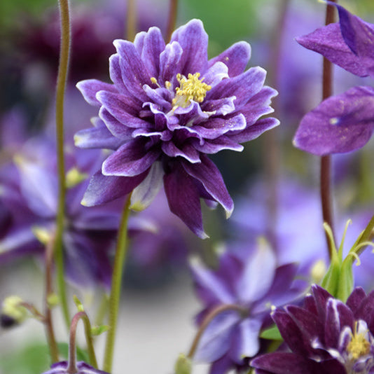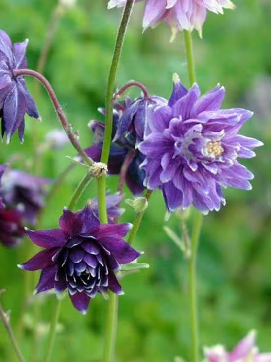 Ses fleurs doubles, d'un violet profond aux pointes blanches, forment de charmants pompons qui dansent gracieusement au jardin. Cette vivace élégante, atteignant jusqu'à 3' de hauteur, s'épanouit de mai à juillet, apportant une touche de mystère et de raffinement à vos massifs et bouquets.