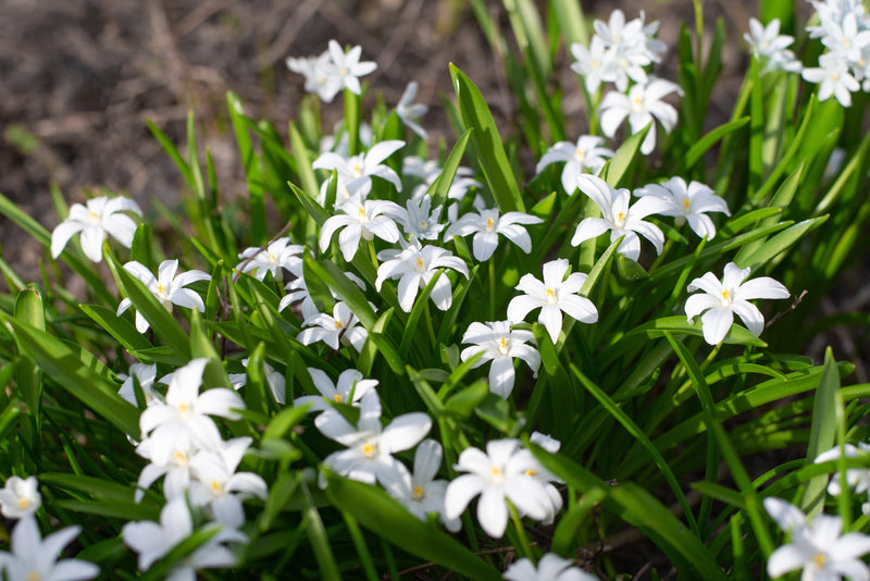 Les chionodoxa, également appelés gloires des neiges, sont le petit détail qui ajoutera de la magie à votre jardin grâce à ses petites fleurs en forme d'étoiles. Sa floraison hâtive annonce l'arrivée du printemps dès la fonte des neiges! Ils se multiplient très bien et couvrent le sol avec les années.