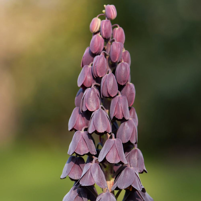 Les fritillaires Persica sont un de nos plus gros coups de coeur. Cette variété, d'un grand raffinement, en vaut l'investissement en nous récompensant avec des tiges époustouflantes extra longues de fleurs en forme de clochettes vertes pomme qui tournent au violet foncé intense, presque noir, à mesure qu’elles ouvrent. Les feuilles gris-vert sont aussi un bel ajout.