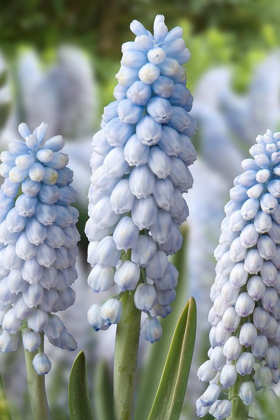 Petite merveille aux grappes de micros clochettes d'un bleu pâle poudré et au parfum musqué. Les muscaris accompagnent parfaitement les narcisses qui fleurissent durant la même période. On préfère les planter en petits massifs.
