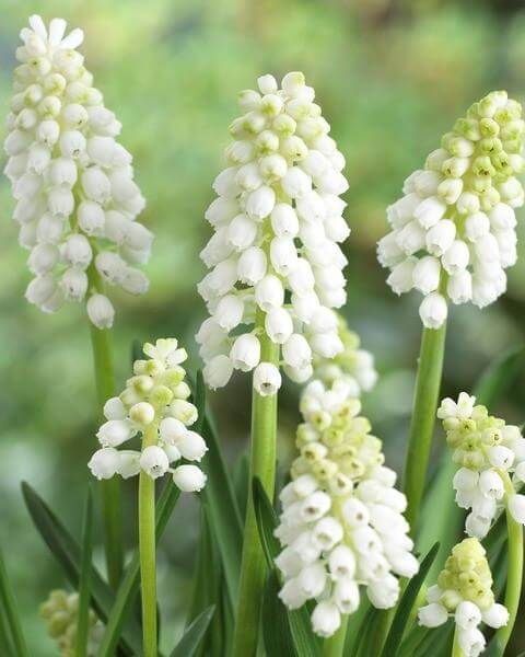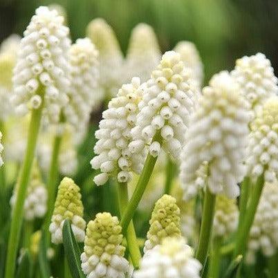 Petite merveille aux grappes de micros clochettes blanches et au parfum musqué. Les muscaris accompagnent parfaitement les narcisses qui fleurissent durant la même période. On préfère les planter en petits massifs.
