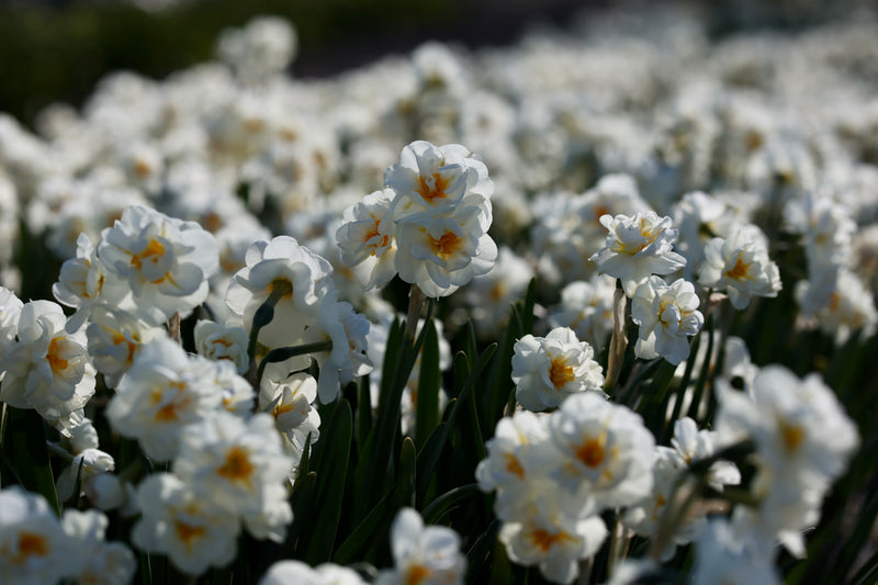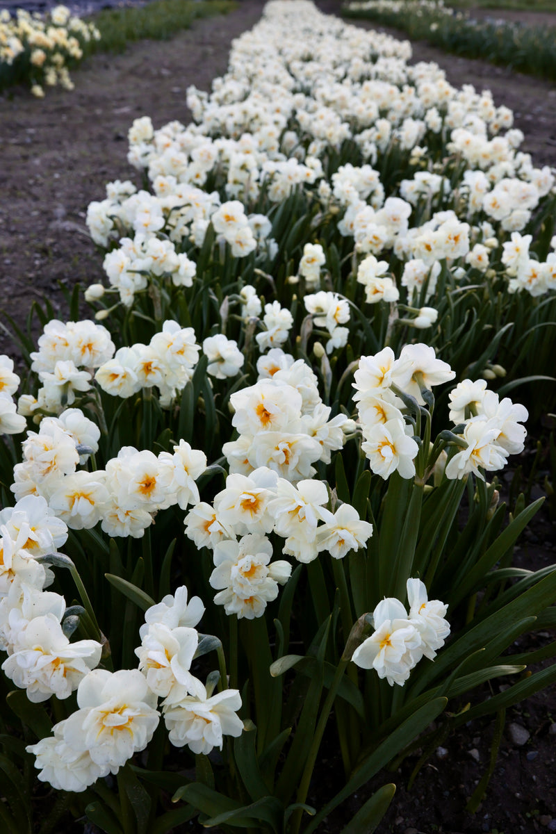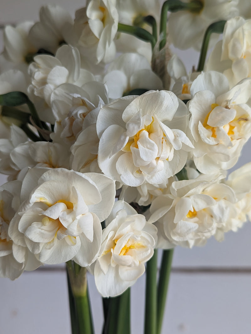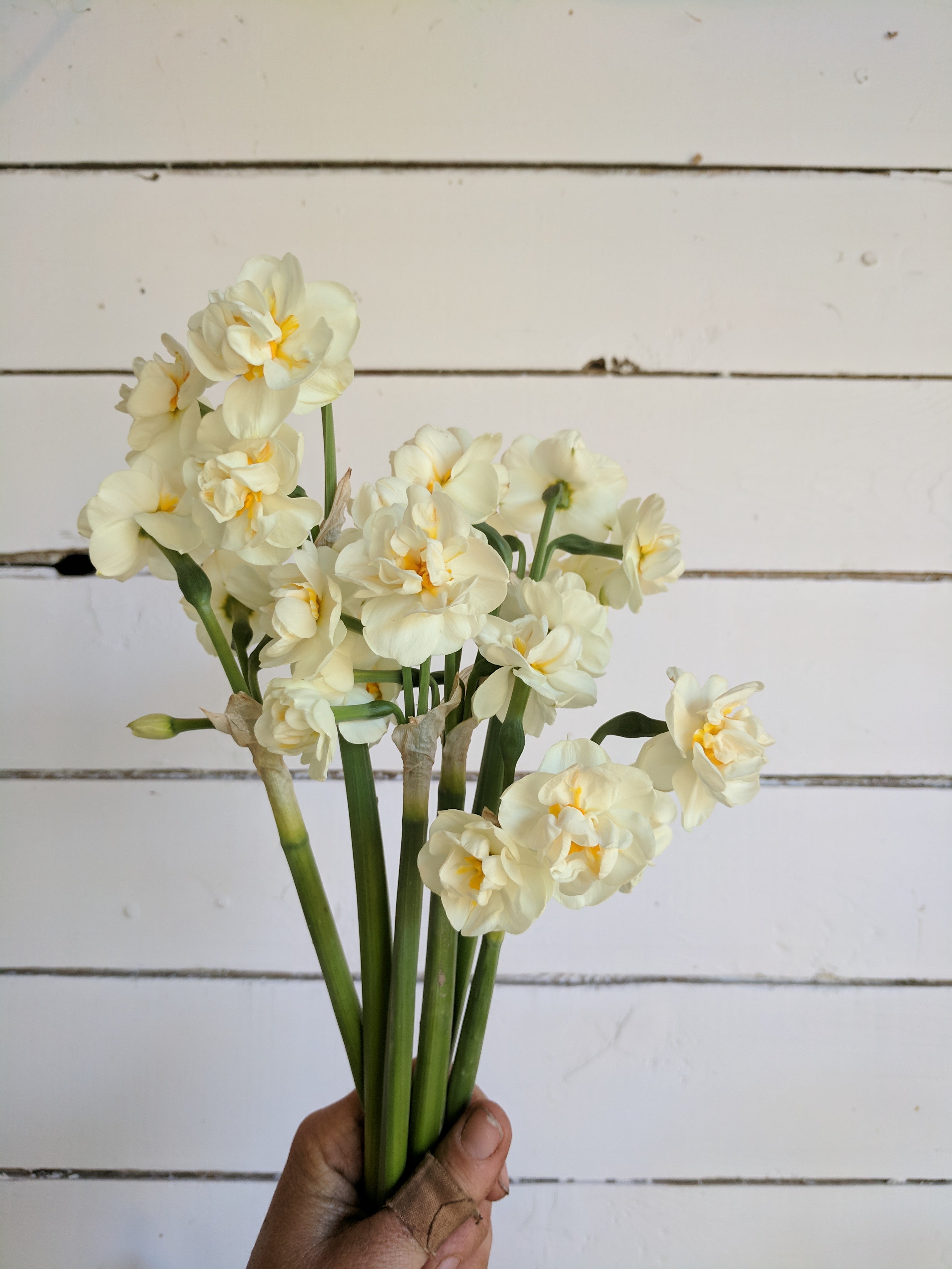 Une de nos variétés de narcisse favorite. On en a planté des centaines à la ferme afin d'en récolter de longues tiges arborant de multiples fleurs doubles par tige. Sa productivité incroyable et son parfum de printemps est tout doux.