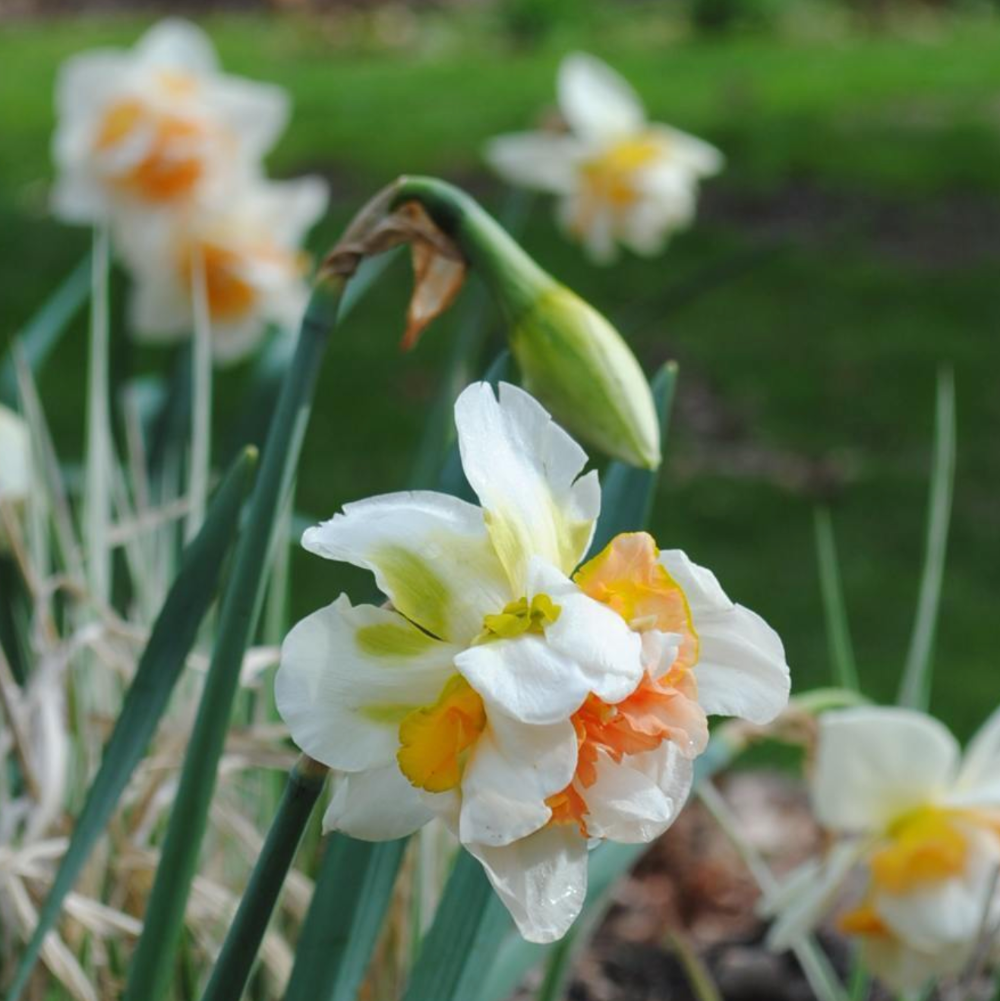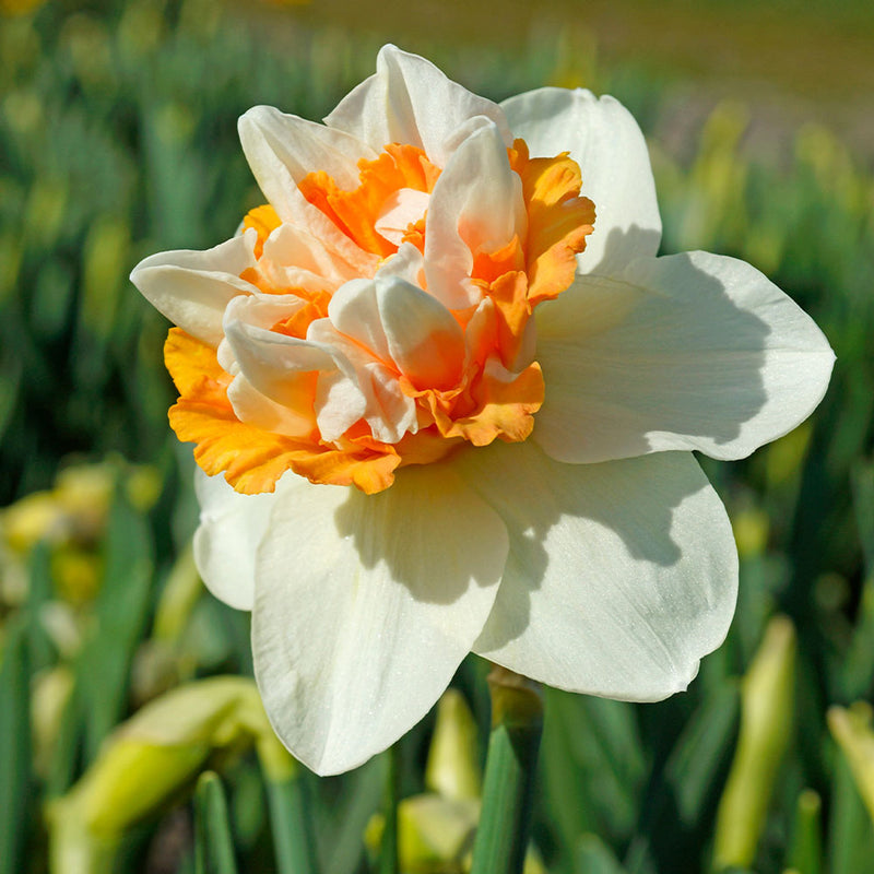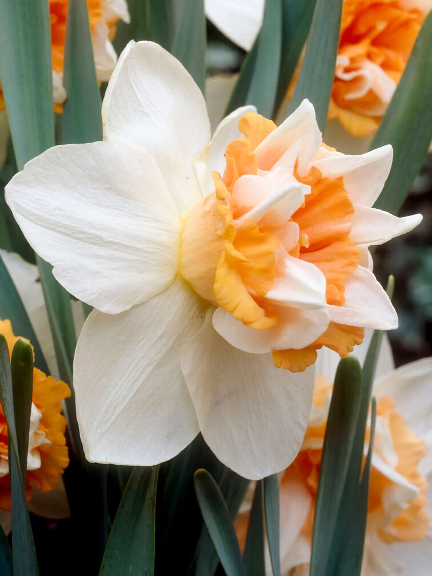 Fleurs aux centres denses, orange saumon/tangerine, entourés de pétales extérieurs ivoires avec des tons vert citron sur le revers. Les énormes fleurs dégagent un doux parfum printanier.