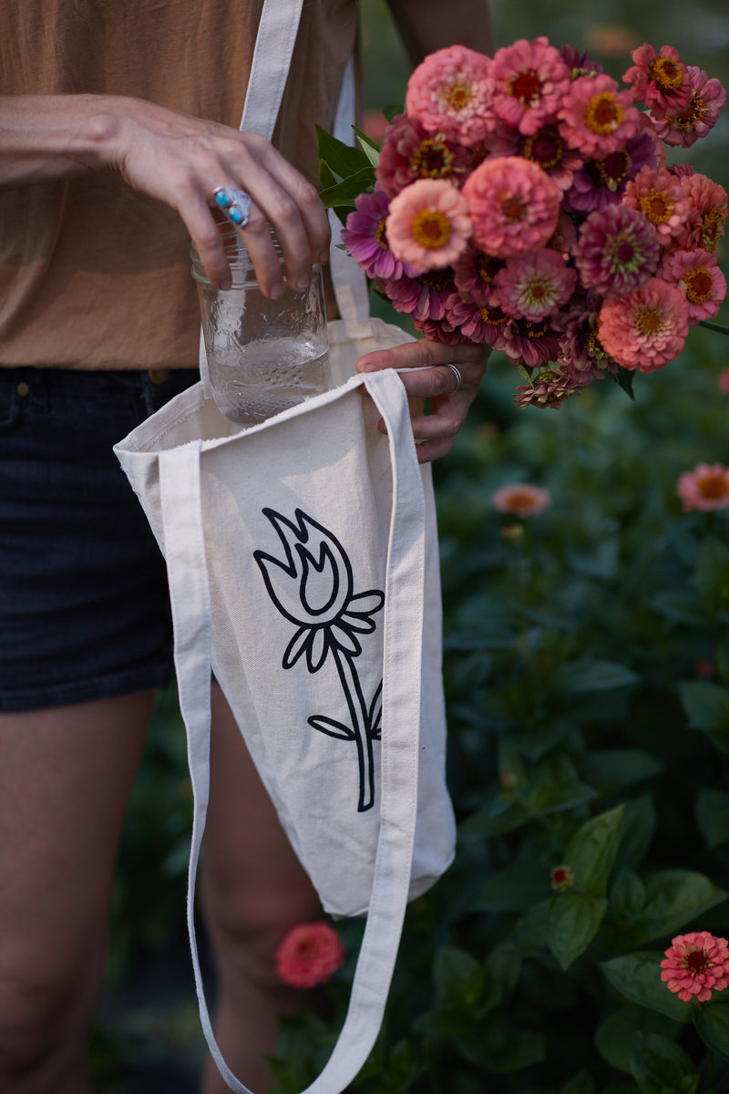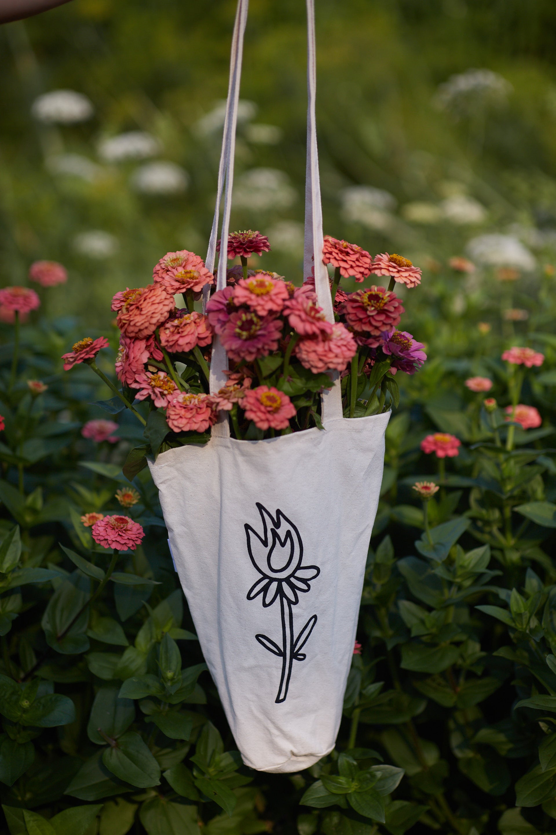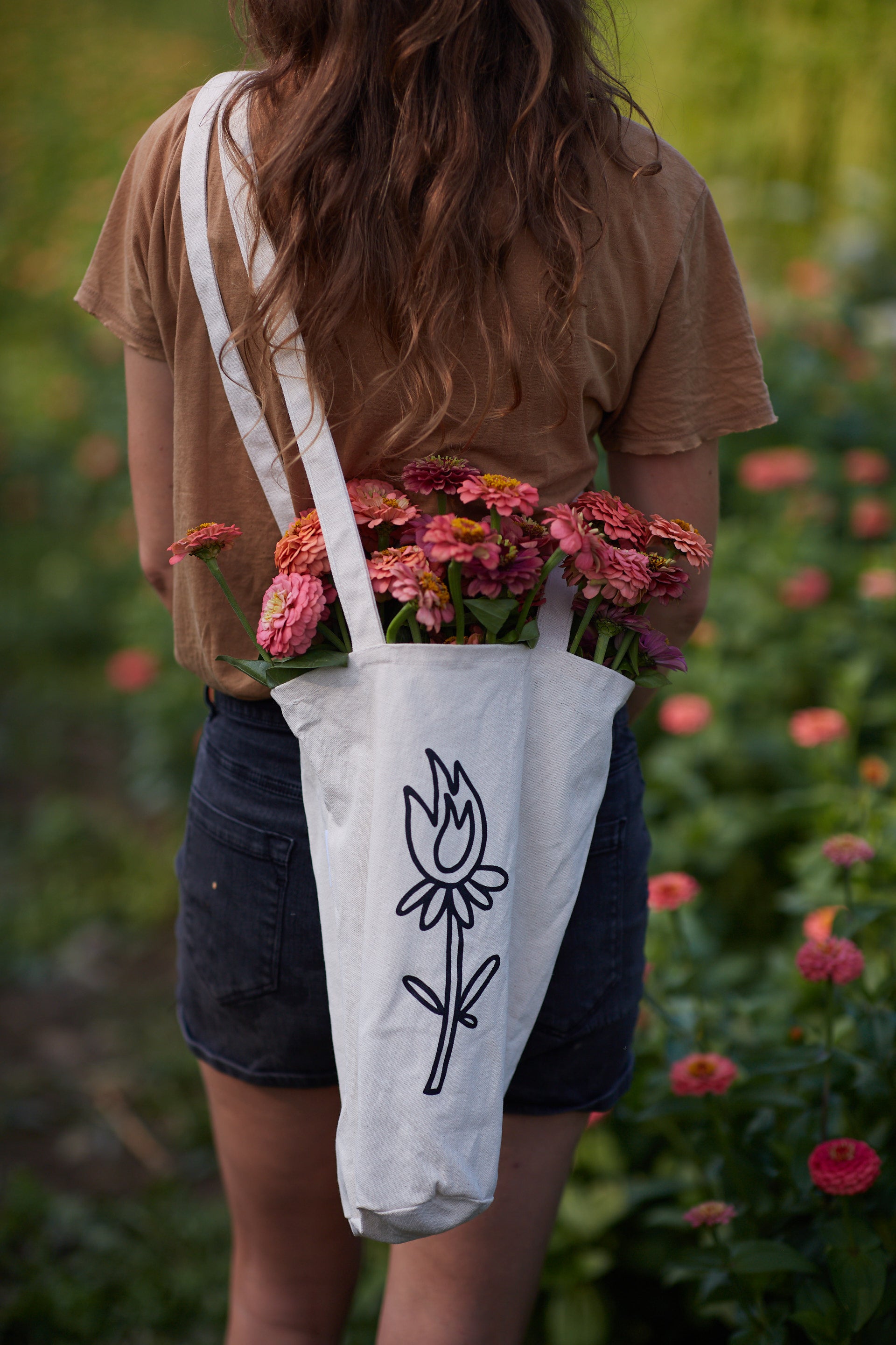Nous voulions un sac spécialement adapté pour transporter des fleurs. Quand on achète des fleurs fraîches, on veut s'assurer de les hydrater rapidement pour maximiser leur durée de vie en vase. Notre sac est conçu avec l'espace nécessaire pour y mettre un pot Mason avec de l'eau au fond.