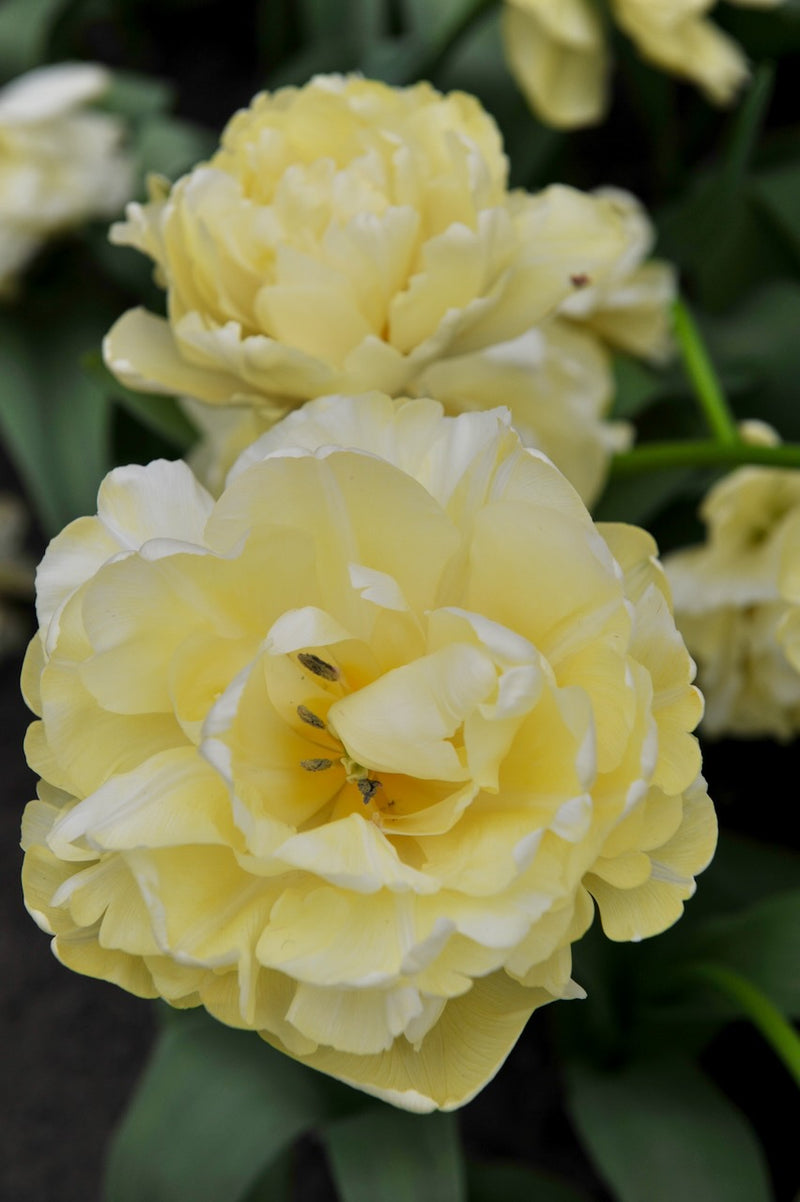 Cette variété est très agréable à travailler grâce à ses longues tiges solides. La couleur crème qui tire sur le jaune se concentre au centre de chacune des fleurs et s'évanouit à mesure que l'on approche du bord des pétales. Les fleurs doubles légèrement chiffonnées sont d'une générosité sans pareil avec une touche certaine de romantisme.