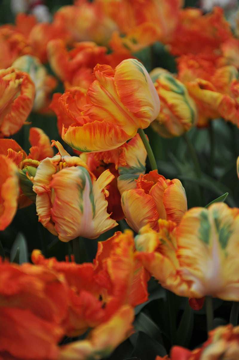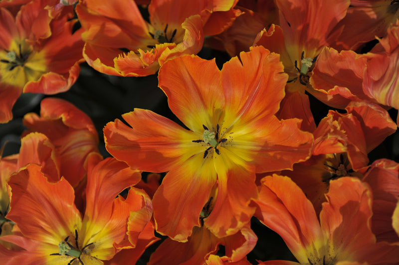 Un peu semblable à la variété flaming parrot, cette tulipe perroquet est tout simplement géante. Ces longues tiges épaisses portent des boutons floraux ondulés d'une taille spectaculaire. L'extérieur des pétales orné de vers cache un trésor ensoleillé mêlant des teintes, bouton d'or et tangerine.